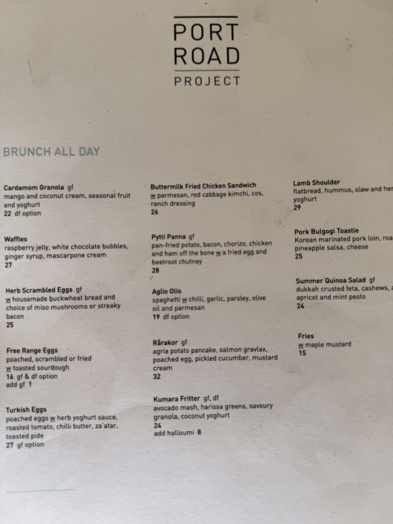 This cafe offers an interesting range of menu and cabinet food, great coffee and swift service. I chose the “Rarakor” (see menu below) and rapidly downed a couple of strong Long Blacks while relaxing to the comings and goings of other customers.